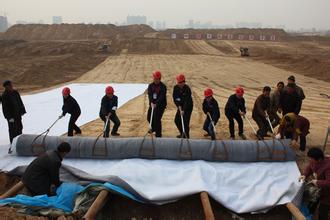 施工簡便:產品幅寬可達6米,長度最長可達40米,大大提高了施工效率。施工時只需將ST-GCL防水毯平鋪在地上。立面或斜面施工時,用釘子和墊圈將其固定,并按要求搭接即可;不受施工環境溫度的限制,0℃以下也可施工。